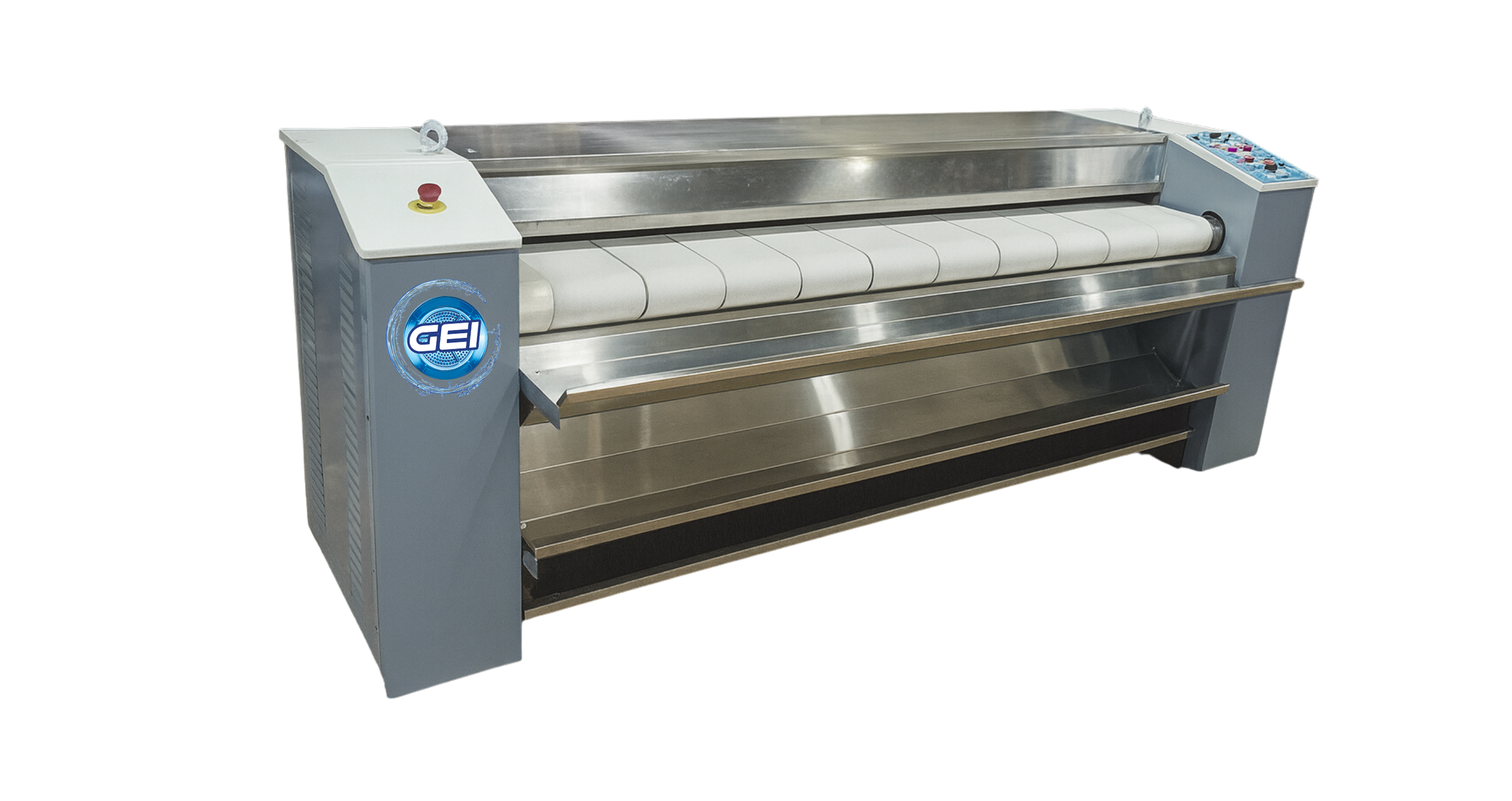 GEI FLAT WORK IRONERS are used to press bed sheets, pillow cases, table, linens, etc automatically. It’s primary purpose is to remove wrinkles and they also dry the linens at the same time. The ironer is a machine with a large heated roller, the linen are fed into the roller to iron and dry them. The feeding and heating belts are of Nomex brand.